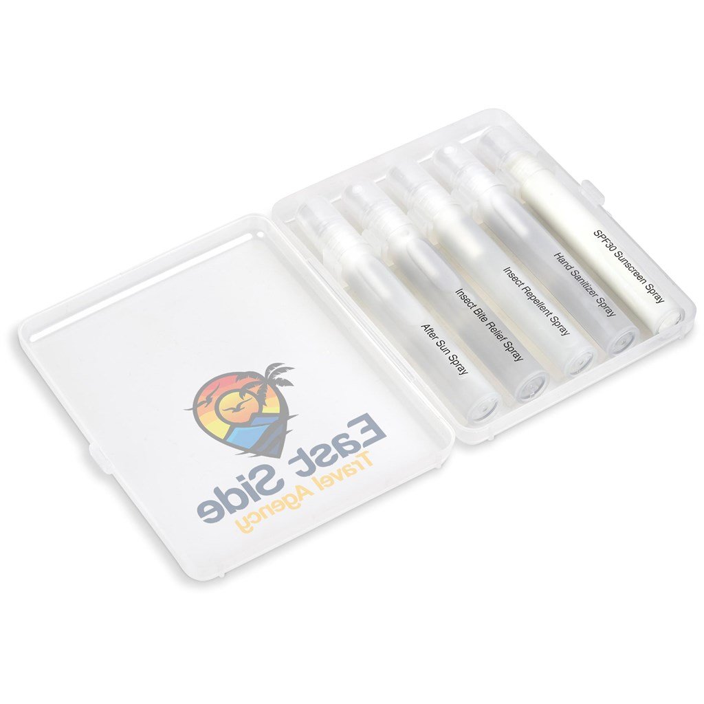 Take this clever and compact kit with you when travelling, camping, picnicking, or hiking. It features 5 useful sprays, securely packed together in a durable transparent case.